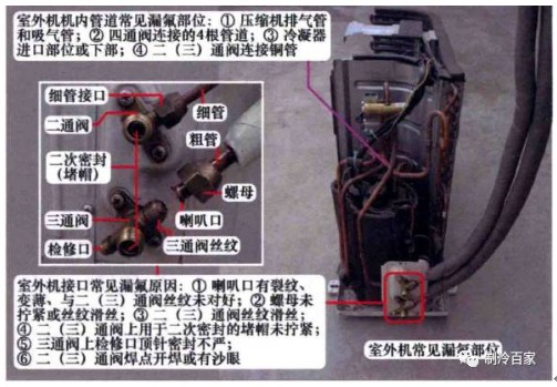 1)、二通阀和三通阀阀芯损坏, 系统漏氟。 2)、二通阀和三通阀堵帽未拧紧, 系统漏氟。 3)、三通阀检修口顶针坏, 系统漏氟。 4)、室外机机内管道有裂纹