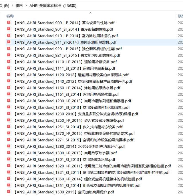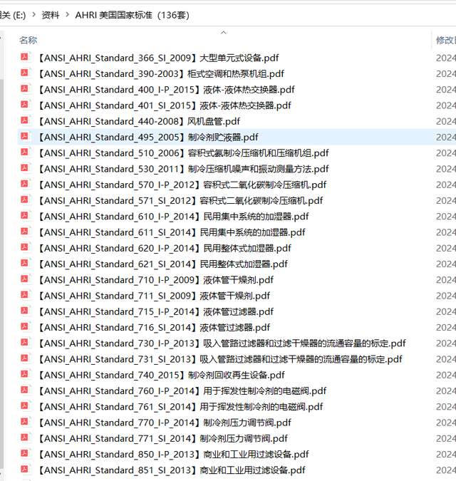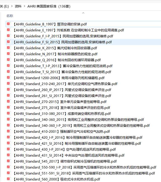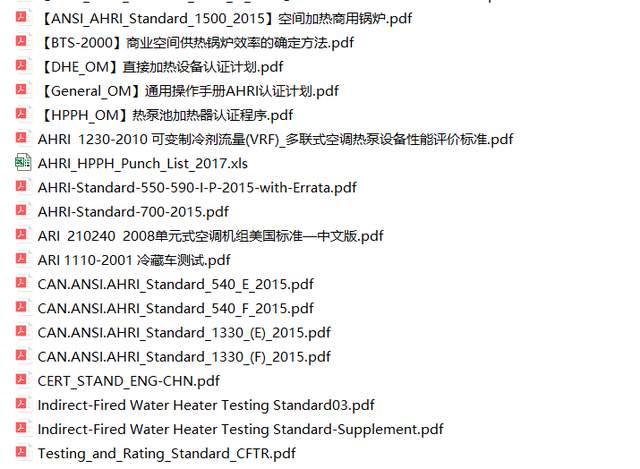 为了方便各位粉丝关于ANSI/ AHRI(美国国家标准)制冷行业相关标准的下载,小编特地整理了一套关于AHRI标准下载的资料包,收集了目前市面上的AHRI的标准库,目前足足120套+,后续有更新也会立马更新到该资料包中,,目前的资料截图如下: