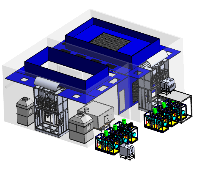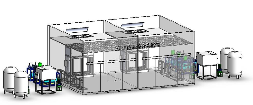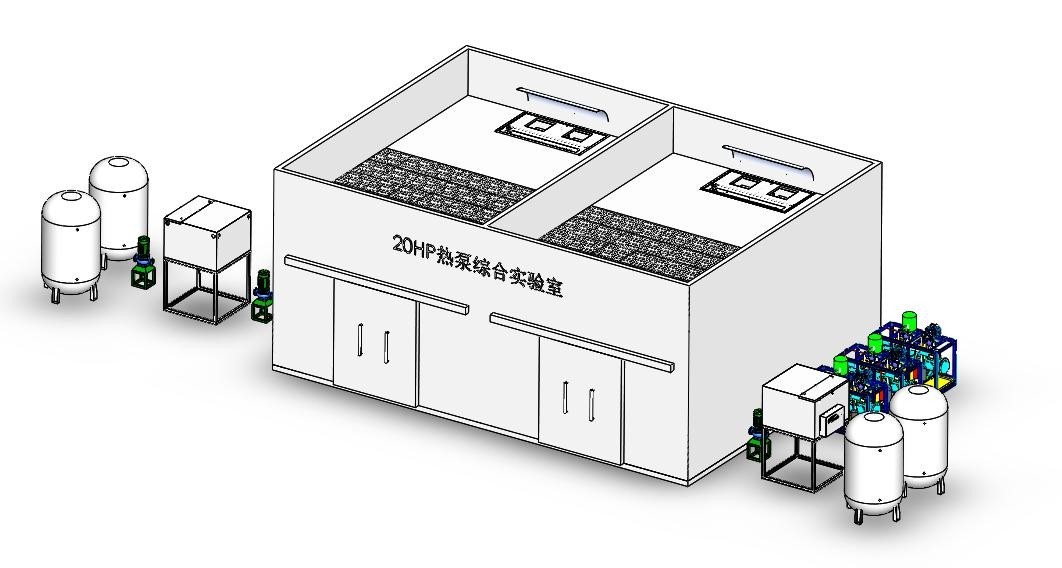 本实验室主要测试空气源热泵(家用5HP以下)、热泵热水机(家用5HP以下)、热风机;本实验室可同时测试4台5HP家用机,满足测量20HP的能力。本实验室主要测试空气源热泵(家用5HP以下)、热泵热水机(家用5HP以下)、热风机;本实验室可同时测试4台5HP家用机,满足测量20HP的能力。共分两个房间,室内侧和室外侧均满足不同机型最大20HP测试工况需要,两个房间可单独控制工况;实验室房间尺寸约:(室内:11m*6m*5.5m;室外8.5m*6m*5.5m)