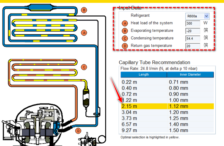 绿色部分是​推荐的毛细管长度和直径;不过这毕竟是软件理论的计算结果,在实际的设计和调试当中,可以先按照这个理论值来做出实物来调试,然后再实验室当中调试毛细管,对照下​制冷系统的运行参数,判断毛细管的长度和直径是否选择合适。 ​2.3 电脑版本: 我们再来看下电脑版本的,电脑版本的用法一样,我们​根据上面的参数再来设定一遍参数: